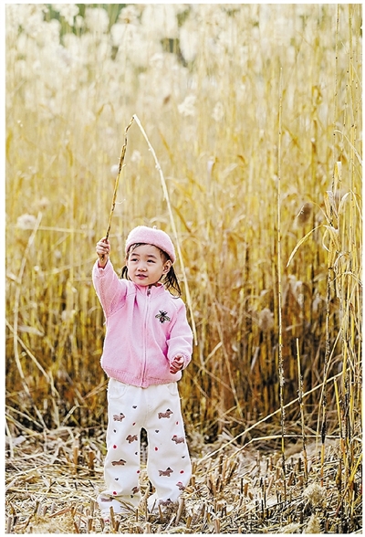 当天,一名小女孩在北京园博园的一片芦苇荡中玩耍。