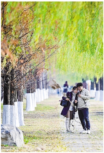 11月15日,游客在北京园博园的一条小路上驻足。初冬时节,北京园博园内树木色彩斑斓,不少市民趁着周末来到这里,或散步赏景,或静坐小憩,享受一段惬意的休闲时光。