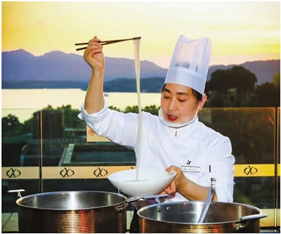 2021年,新侨饭店邀请100名环卫工人来到酒店,在10楼露台上,我给每位工人煮上一碗贡面。平时我给客人下面条,一束贡面下6碗,给他们下时,我一束贡面下4碗,希望他们吃出味道,还能吃得饱饱的。