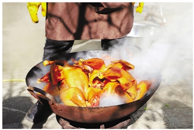 走进“竹缘山庄”的院子,一股混合着糯米焦香与鸡肉鲜香的气息扑面而来。一口大铁锅架在柴火炉上,锅底铺着糯米与红糖,严淑媚小心翼翼地将晾晒好的土鸡摆放在蒸架上,一次正好放下5只。“盖锅盖时要快,边缘用毛巾围紧,这样烟雾才不会跑掉。”她熟练地操作着。不过五六分钟,白色的烟雾便从锅盖缝隙中溢出,浓郁的香气也随之扩散开来。