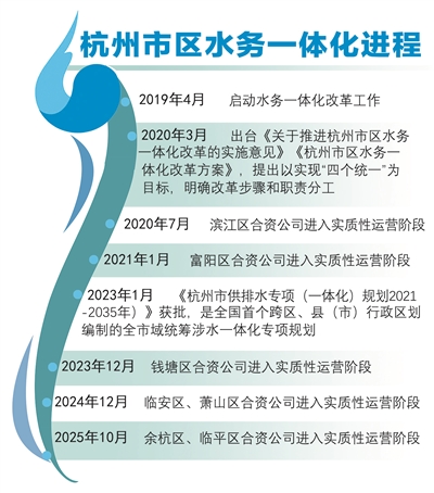 2019年4月,杭州正式启动市区水务一体化改革,随后市政府发布《关于推进杭州市水务一体化改革的实施意见》,明确以市水务集团为改革经营平台,推进全市水务“规划布局、资源调配、服务标准、管理政策”四个统一——此项改革恰与“十四五”规划中“推动绿色发展,促进人与自然和谐共生”以及提升城市基础设施运行效率和民生服务保障水平的要求同频共振。