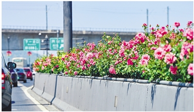 蜿蜒盘旋的高架上,绵延的月季花带组成绚烂的“空中花廊”,一路生花,这是杭州人的专属浪漫。