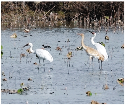 11月27日上午,一对白鹤带着一只尚未成年的小鹤现身余杭南湖的荷塘,被幸运的观鸟爱好者发现,在远处架起“大炮筒”,频频按下快门。白鹤属大型迁徙涉禽,主要栖息于开阔的沼泽草地、湖泊岸边及浅水湿地,成年白鹤通体羽毛洁白,脸上裸皮红色,身高在130厘米至140厘米,正常寿命可达70多岁,在中国历来被赋予吉祥、长寿的美好寓意。全球白鹤原有三个种群,分别按中、西、东三条路线迁徙,在过去20多年里,中部和西部种群几乎灭绝,只剩下途经中国的东部种群。据世界自然遗产保护联盟统计,目前全球范围内白鹤数量已经不足4000只,其中98%在鄱阳湖越冬。白鹤在《世界自然保护联盟濒危物种红色名录》中已被列为极危物种,在中国被列为国家一级保护动物。近年来,余杭的南湖与北湖已多次记录到白鹤停留,表明通过多年的湿地保护,南湖和北湖已成为白鹤种群东线迁徙途中的重要停歇地。 记者 李忠 摄