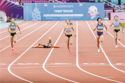 冲刺瞬间,四川选手刘英兰身体失衡,重重摔倒在终点线前。突发状况让全场惊呼,摄影记者的本能差点让位于一个人的本能——我几乎忘了按下快门。