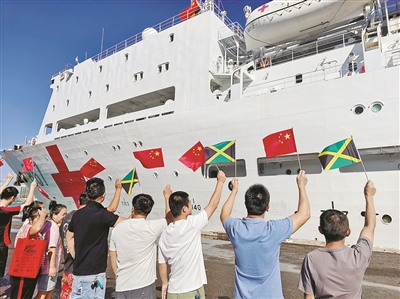 12月4日,执行“和谐使命-2025”任务的中国海军“丝路方舟”号医院船抵达牙买加蒙特哥贝港,当地华侨华人代表欢迎医院船到来。