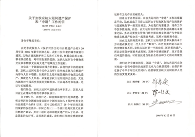 2005年12月15日,一封八百余字的信函自杭州发出,飞向京杭大运河沿线十八座城市的市长案头。署名者是三位平均年龄接近八十岁的老人:九十岁的郑孝燮、八十二岁的罗哲文、六十一岁的朱炳仁。他们在信中感慨:“京杭大运河可是个无价之宝呀!”并疾呼加快其保护与“申遗”工作。