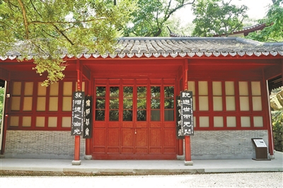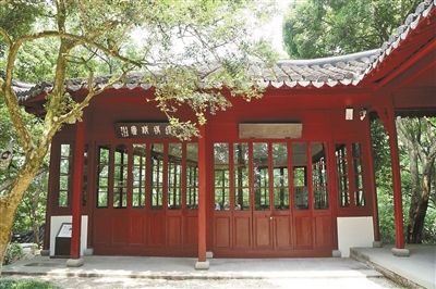 孤山西侧,顺山道往上,小盘谷以西平坡,得见相映成趣的两处红柱灰砖的建筑。一是遁庵,另一则是还朴精庐。遁庵地势稍高,青瓦房檐造型古朴,与还朴精庐相互勾连。竹林葱郁,四时花锦,掩映着遁庵内陈列的石拓碑文,使此处别具一分出世的沉静意蕴。林木交陈间,苏堤景色遥可眺见,使人不免遐想春风来时,还朴精庐为一山鲜花簇拥的景色。