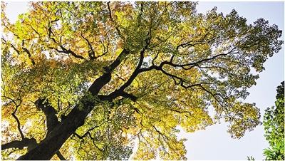 “双碑亭”前,亭边有三株1030年树龄的古枫香并排而列,最靠外边的一株长势特别好,完全没有一丝老态,它树高44米,是杭城古树界一个“巨无霸”。它的枝条像龙蛇舞动,仿佛要将天空全部染成橙红和橙黄。在夕阳的照耀下,古枫香高高的树梢,宛如大片的彩云飘动,千年古树的气场令人震撼。