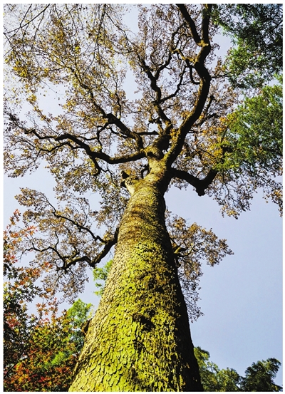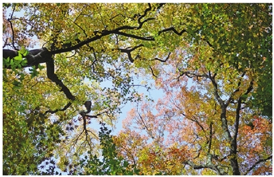 云栖,相传这里常常升起五彩云霞,经久不息。深秋一日,我再次向云栖竹径深处走去,洗心亭前一棵枫香,树龄1030年,胸围4米多,树高34米,像一座通天的高塔。它的树梢上彩叶已落不少,浓郁稍欠,但是每次仰望,每次都会被它的气势所震撼。