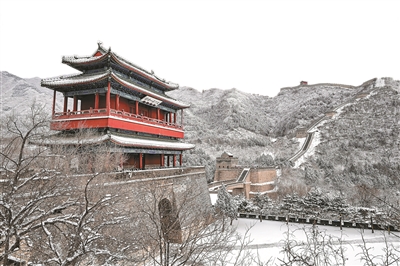 1月17日至18日晨,北京迎来降雪。雪霁天晴,居庸关长城内外银装素裹,尽显雄关壮美。图为18日拍摄的居庸关长城北关城楼雪景。