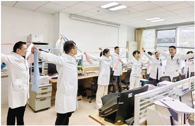 医护人员利用休息时间在办公区健身。