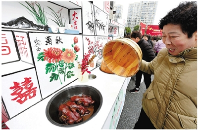 “哎,这年糕是绿的!”围观的村民们好奇地打量着,你一言我一语地评论着。