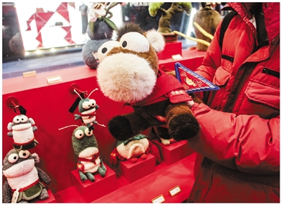 店长燕子边指挥店员给柜台补货边说:“悟空庙是线下店独占款,自快闪店1月18日开业以来,就成了爆款,其设计灵感来自1964年风靡全国的动画片《大闹天宫》中孙悟空所变的一所土地庙,古建筑造型+现代Q版设计,深得年轻顾客喜爱。不少人都希望通过它讨个新年好彩头。”除此之外,还有“一马当先”玩偶,造型为一匹珠圆玉润的小马背上插着京剧靠旗,一直处于售罄状态,现在要想买到,只能等线上通知了,目前全国已售8万多只。