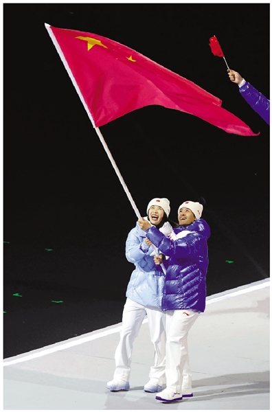 中国代表团旗手宁忠岩(右)、张楚桐在冬奥会开幕式上入场。新华社记者 杜潇逸 摄