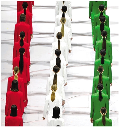 模特身着代表意大利国旗颜色的服装入场。 新华社记者 张豪夫 摄
