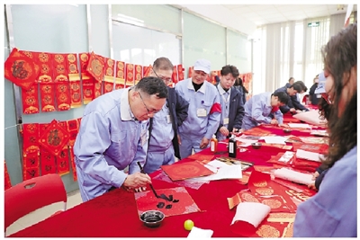 昨天中午,位于杭州综保区内的玳能科技(杭州)有限公司职工文化长廊内墨香四溢,该公司的传统写福送春联活动正在这里举行,今年的主题是“廿载工韵筑同心·马岁翰墨迎新春”。长桌旁,公司书画社长冯明华领衔,成员魏娟等专注挥毫,一个中午已写下近百个“福”字。每当有同事前来求字,魏娟总是笑着应允。“能给同事们送手写祝福,累也值得。”她身旁围满了身着工装的一线职工,有的细细品评书法,有的拍照留念,一副副寓意吉祥的春联在大家手中传递。