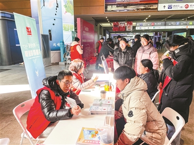 离检票还有段时间,通廊里一处热闹的区域吸引了她的目光。红色背景板上,“乐业萧然 春暖农民工”几个大字格外醒目,几张长桌一字排开,不少和她一样候车的旅客正围在那里。