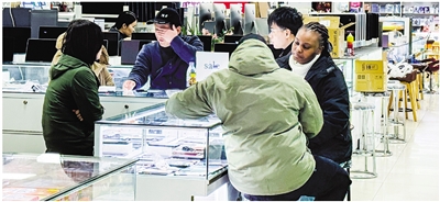 在百脑汇2楼的手机柜台前,两位来自肯尼亚的友人,正拿着两款手机仔细比对。记者上前用英语交流得知,他们此次是帮朋友代购。“他们经常来我这里买手机,都是老主顾了。”柜台老板娘笑着说,她以前做过外贸,英语底子不错,很多国际友人愿意来她这里消费。