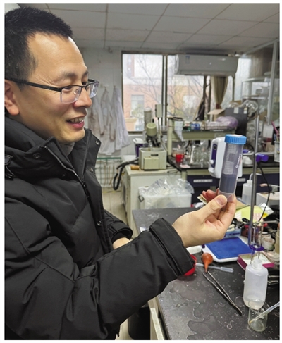 江华在实验室里向记者展示卡宾染料成品。