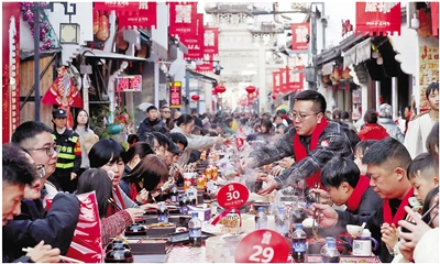 2月11日,南方“小年”。当日下午,“马上‘宋’福——严州包子宴”在建德市梅城镇严州古城的老街上一溜排开,千余名当地居民与各地游客围坐在长桌前,一起分享热气蒸腾的建德豆腐包及严州干菜鸭、国太豆腐、柴火鸡等6道本土传统名菜,复刻宋代“邻里共飨”盛景,欢享马年团圆年味,也由此拉开了古城“浙江年·严州年”春节系列活动的序幕。