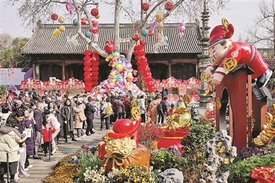 本报讯(记者 俞倩 文 李忠 摄)昨日,西湖迎春花展与《太平年》官方特展联袂登陆钱王祠,为市民游客呈现一场花开满堂、福气盈门的新春盛宴。