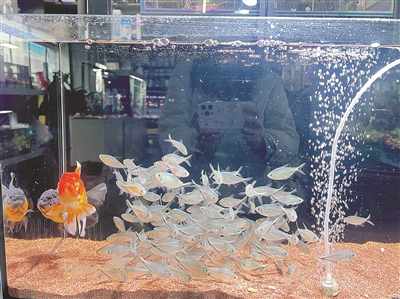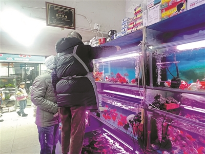 不少家庭带着放寒假的孩子前来,水族区成了最吸睛的角落。10元钱7尾的“彩斑马”在光线下变幻出蓝绿、橙红、荧黄等色彩,斗鱼、黄金大胡子、皮卡丘等数十个品种在鱼缸里摇曳,寓意吉祥的 “鸿运当头”、造型可爱的波妞,则是孩子们新年礼物的热门选项。