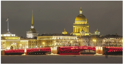 2月15日晚,俄罗斯圣彼得堡冬宫桥亮起“中国红”,迎接马年春节。 新华社发(莫京娜 摄)