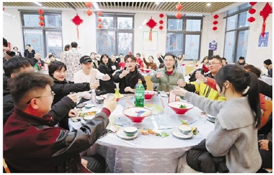 位于钱塘区的宁巢·钱塘公寓社区食堂内也暖意升腾——以“心安处・即吾家”为主题的暖心年夜饭,在这个入住产业工人及新市民4600余人的大型社区里热闹开席。来自东北、西北、川渝、闽粤等地的新杭州人围坐圆桌,品着带有家乡味的菜肴,用各地方言互道新年祝福,陌生的地域隔阂在欢声笑语中消融。