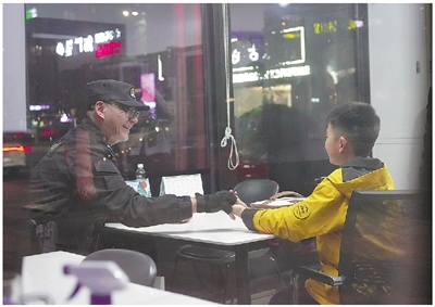 很快,孔少华又要开始新一轮的巡逻。他收好餐具,装回儿子带来的保温袋里。他掏出手机,打了一辆网约车。几分钟后,车子到了,他摸摸儿子的头,将儿子送上了车。