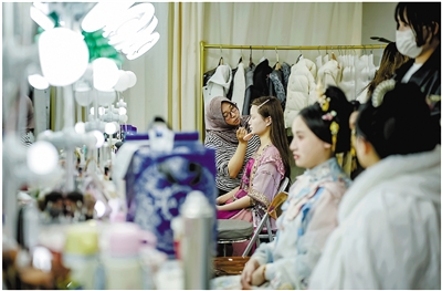 一旁的造型师解释,张女士体验的是电视剧《云之羽》同款汉服,在西湖、云栖竹径等地拍照特别出片,妆容是更符合现代审美的、整体偏清冷感的风格。看着身裹层层薄纱的张女士,记者问她打算去哪里拍、怕不怕冷,她充满期待地说:“没关系,我有带厚衣服的!”