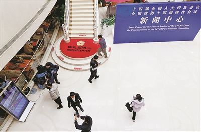 2月27日,媒体记者和工作人员在全国两会新闻中心忙碌。 新华社发