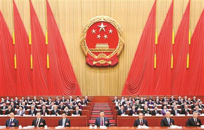 人民大会堂万人大礼堂气氛庄重热烈,主席台帷幕正中的国徽在鲜艳的红旗映衬下熠熠生辉。