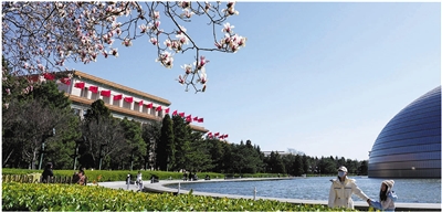 3月9日,游客在国家大剧院旁欣赏盛开的玉兰花。近日,随着气温回升,北京街头的玉兰花渐次开放。 新华社记者 鞠焕宗 摄