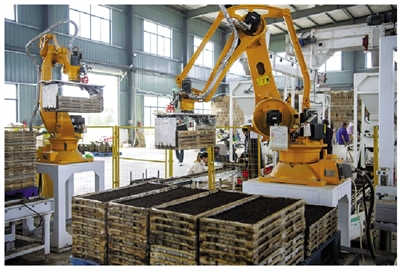 机械手在自动化育秧流水线上搬运秧盘。张辉 摄