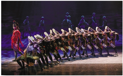 然而,《骑兵》的核心价值正在于“铁骑”与“柔情”的辩证统一——“铁骑”是历史的重量,“柔情”是生命的温度。要实现经典化,就要回归舞蹈本身。其一,多媒体的运用要克制。将投影从主要用于叙事转化为用于辅助表达情感,比如用草原星空的淡影替代炮火动画,用风的流动的光影强化表现珊丹孤独的等待,让影像成为表演的延伸而非替代品。其二,强化群舞的特质:骑兵冲锋的群舞需融入草原骑兵的动作元素(如套马杆的挥摆、骑马的颠簸感),通过不同力度的演绎(前排演员猛冲,后排演员跟进,形成浪潮般节奏),强化雷霆般的视觉冲击;草原群舞需加入蒙古舞的经典动律(如肩抖、碎步),让地域特质成为动作的基因。其三,为表演注入地域性格特征:演员需着重表现草原人的生命状态——朝鲁的“刚”应是手臂的肌肉线条、步伐的沉稳,表现草原汉子的粗犷;珊丹的“柔”应是腰部的灵活扭转、眼神的清亮等,表现草原姑娘的坚韧;尕腊的灵性则要契合草原的辽阔,比如加入“尕腊在草原奔跑”的段落,演员用大跳、滚翻等动作模拟驰骋的战马,象征草原精神。