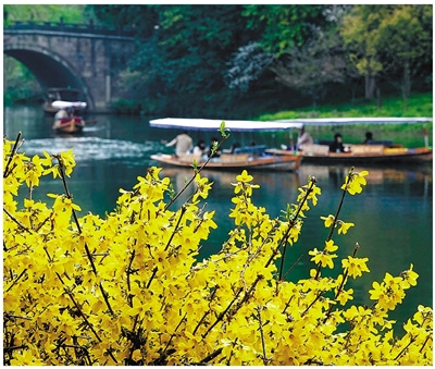 春分已过,清明将至,西湖湖西的乌龟潭景区满目翠绿,水岸边的樱花、海棠、连翘、喷雪等各色春花竞相绽放,吸引不少游客乘坐摇橹船前来赏花探春;船行碧水中,倒影起微澜,又成为岸上游客眼中的一道风景。记者 李忠 摄