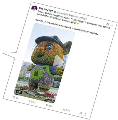 本报讯(通讯员 沈欣宁 叶灵莹 记者 任彦 熊艳)近日,外交部发言人毛宁在海外社交平台发文,向全球推荐杭州街头的“多肉猪猪”立体花坛,引发海外网友广泛关注与好评。她在文中写道:“位于中国东部的杭州,一只巨大的‘福气猪猪’被88000多株多肉覆盖,这些多肉有20个品种”,并给予“闹市之中藏花园,创意之作惊世人”的高度评价,让这座杭州街头的网红景观走出国门,成为展现杭州城市美学与人文温度的新名片。