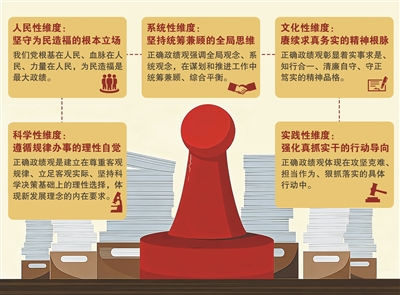 人民性铸魂、系统性谋局、文化性修身、科学性定向、实践性立业,五个维度相互联系、有机统一,共同构成新时代正确政绩观的完整逻辑体系。新时代新征程,广大党员干部要深刻把握这五个维度的丰富内涵,始终坚持为民造福、统筹兼顾、求真务实、遵循规律、真抓实干,把正确政绩观贯穿于干事创业全过程、各方面,以经得起实践、人民、历史检验的实绩,为强国建设、民族复兴贡献应有力量。
