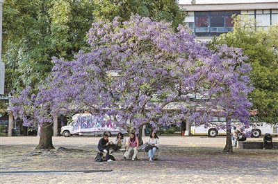 图为新华社记者近日在墨西哥首都墨西哥城墨西哥国立自治大学拍摄的蓝花楹。进入春日,盛开的蓝花楹是墨西哥城最具代表性的景观之一。