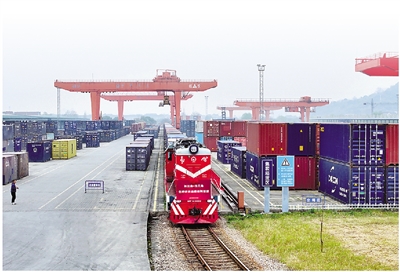 一列满载浙江本土化纤产品的货运班列从杭州萧山站驶出。 梁力 摄