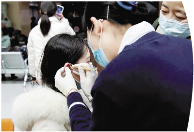 医护人员在为患者做耳穴按压。 省中医院供图