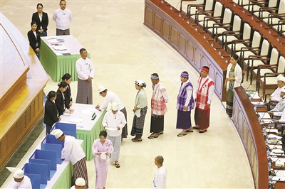 图为3月31日,在缅甸内比都,缅甸联邦议会人民院民选议员团成员在会议上投票选举副总统。