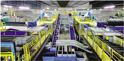 “垃圾”超级工厂内部,自动化生产线高速运转,对塑料、纸张等可回收物进行智能分选。