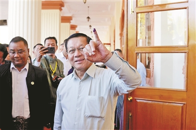 这是2025年12月28日,敏昂莱在缅甸内比都的一处投票站参加缅甸大选投票后展示蘸有墨水的手指。新华社发(伊孟觉 摄)