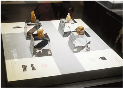 篆刻展区则聚焦徐三庚使刀如笔、疏密相生的艺术精髓。西泠印社自百枚藏品中遴选出“千泉一尺室”“不系舟”等名作参展。印章刀法轻重徐疾间,章法疏密相生,或沉稳内敛,或纵逸洒脱,将徐三庚篆刻艺术的独特魅力展现得淋漓尽致。“蔡和霁印”“涤峰一字月笙”等印,则是婉转挺秀,冲切相济,把“使刀如笔”的篆刻匠心,藏进每一处刀痕之中。西泠印社理事朱培尔指出:“徐三庚是清中晚期具有代表性的篆刻大家。他的篆刻技巧融汇浙派与皖派的精髓,自成流丽俊逸之风,在篆法、刀法上展现出极强的个性与辨识度。其作品风格中暗藏的现代性,值得当代篆刻家借鉴与学习。”