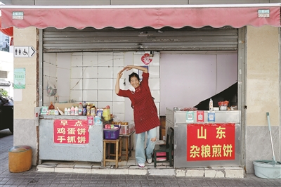 梅阿姨的舞蹈也为周围的人带去了不少欢乐,“她只要一跳舞,我就会掏出手机拍,也不为别的,就是看着高兴!”蛋饼店正对面的万寿亭农贸市场保安亭里,穿着制服正在值班的保安方师傅笑着说,“他们两口子待人特别热情,谁走过去都会笑着打招呼,所以回头客特别多,有的人吃他家的煎饼都吃了有七八年了。”