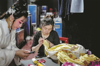 台前热闹,台后忙碌。由羽毛球场临时改造的演出后台,演员们正有条不紊地做着上场前的最后准备。主攻范派小生的越剧演员金玉皎,一边扒着晚饭一边开着网络直播;身旁的化妆师手法麻利,一刻不停地为她打理妆发。