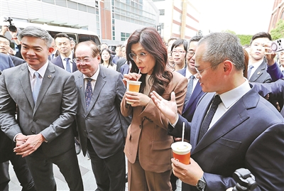 这是4月8日,郑丽文率国民党访问团参访美团上海总部,在体验无人机送外卖时品尝自己点的奶茶。 新华社记者 邢广利 摄
