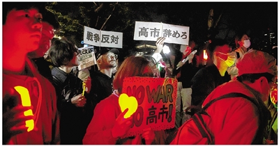 在集会现场,抗议者手持写有“守护宪法第九条”“不要战争”“高市政权即刻下台”等字样的标语,高喊“反对修宪”“反对战争”等口号,呼吁维护和平宪法。