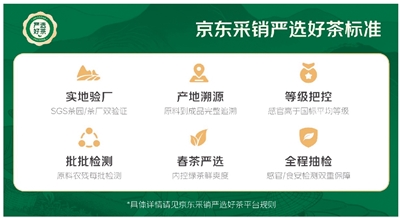 为守护西湖龙井这块“金字招牌”,京东于行业率先推出“严选好茶”品质认证标准,建立从茶园种植、工厂生产、产品质量、销售链路四大保障体系进行全链路品质把控;种植方面,联合国际权威机构SGS深入产区茶园基地,要求茶园种植环境、土地培育、施肥灌溉、农药施用、鲜叶采摘必须严格按照京东标准实施,确保产出高品质原料。